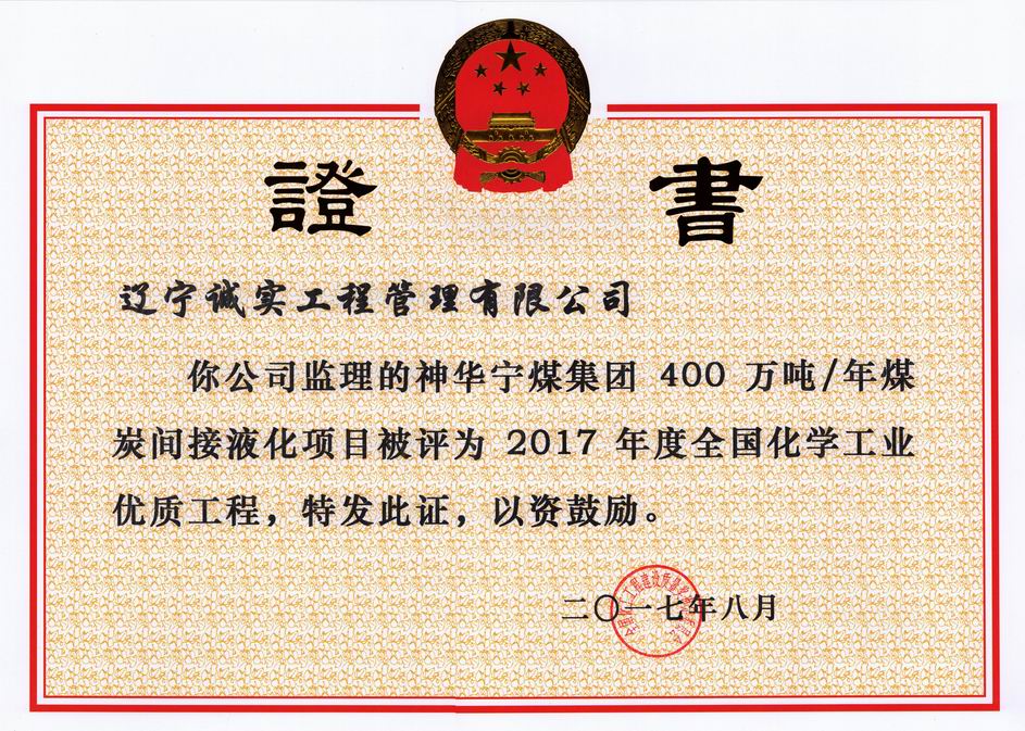 2017年全國化學工業(yè)優(yōu)質工程(神華寧煤集團400萬噸/年煤炭間接液化項目)