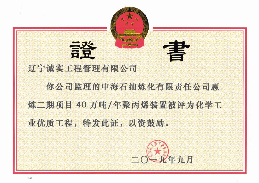 2019年化學工業優質獎(中海油惠煉二期項目40萬噸/年聚丙烯裝置)