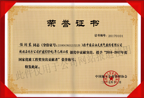 2017年11月10日,根據中施企協字【2017】66號文件——《關于表彰2016-2017年度國家優質工程獎的決定》公告,我單位所監理的“中國石油天然氣股份有限公司撫順石化分公司擴建80萬噸/年乙烯工程”榮獲2016-2017年度國家優質工程獎,該項目總監“任潤東”還獲得了“2016-2017年度第二批國家優質工程獎突出貢獻者”的榮譽稱號。