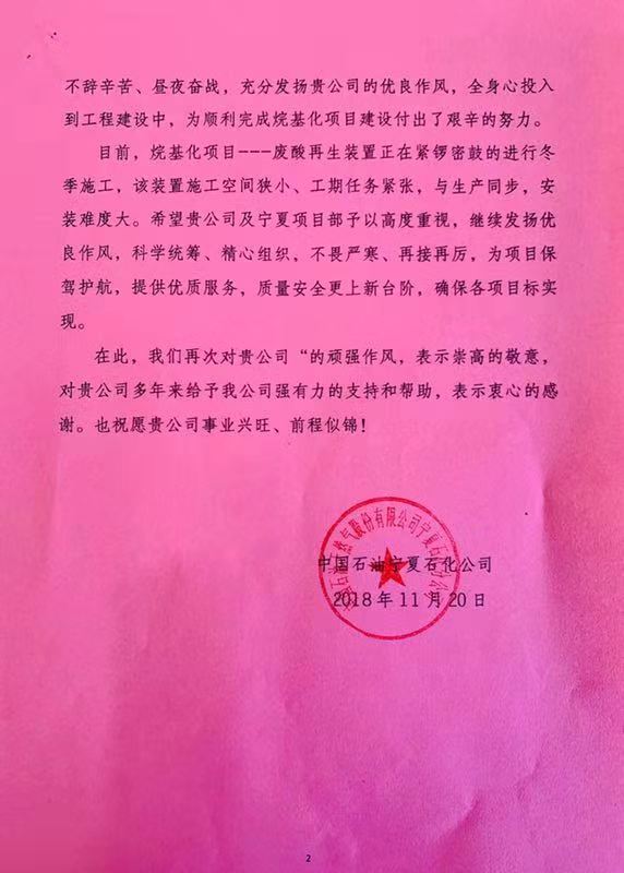 20181120,我公司收到了一封來自業主——中國石油天然氣股份有限公司寧夏石化分公司的感謝信。