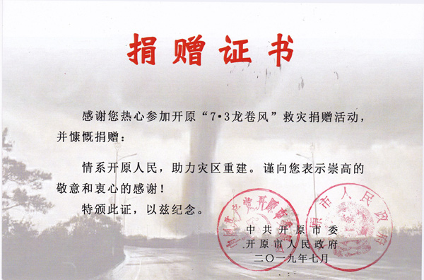 2019年7月3日一場可怕的龍卷風(fēng)席卷了遼寧省開原市,據(jù)初步統(tǒng)計,這場災(zāi)害共造成6人死亡、190余人受傷、2.8萬人受災(zāi),房屋受損6451戶,農(nóng)業(yè)大棚受損25棟,農(nóng)田受災(zāi)14.6萬畝,100余萬平方米廠房遭受嚴(yán)重?fù)p壞,造成直接經(jīng)濟(jì)損失約10.75萬元。災(zāi)情發(fā)生后,省委、省政府及省住建廳領(lǐng)導(dǎo)高度重視,號召全省監(jiān)理企業(yè)為此次災(zāi)情捐款。龍卷風(fēng)無情,人有情。為了幫助受災(zāi)同胞共渡難關(guān),我單位積極響應(yīng)省委、省政府、省建設(shè)廳以及省協(xié)會的號召,在第一時間捐款3000元。參與此次捐款的省監(jiān)理單位共計近30家,捐款數(shù)額從500元至20000元不等。事后,開原市委、開原市政府為我單位頒發(fā)了感謝信以及捐贈證書。