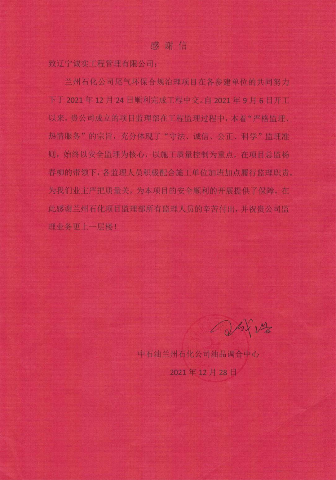 喜訊¦蘭州石化公司尾氣環保合規治理項目順利完成工程中交-項目部收到業主單位感謝信