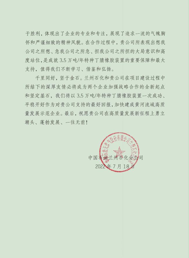 近日,由我公司監(jiān)理的中國石油天然氣股份有限公司蘭州石化分公司--3.5萬砘/年特種丁腈橡膠項(xiàng)目喜獲業(yè)主表揚(yáng)信。表揚(yáng)信充分肯定了誠實(shí)監(jiān)理的工作成果,對(duì)駐蘭州項(xiàng)目部全體監(jiān)理工程師在項(xiàng)目建設(shè)過程中所付出的努力表示由衷的感謝。